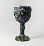 7 ½ in height, this chalice displays the phases of Goddess, Maiden, Mother and Crone. Display of Celtic and Pagan symbolization.